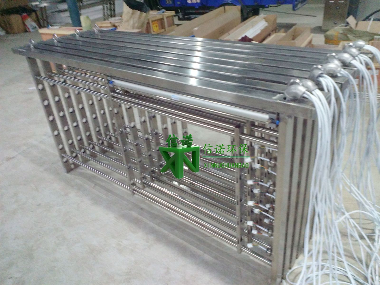 5. 組成:每一套完整的紫外燈模塊組件包括紫外燈管、石英套管、不銹鋼模架以及安裝在其之內(nèi)的機械自動清洗裝置。